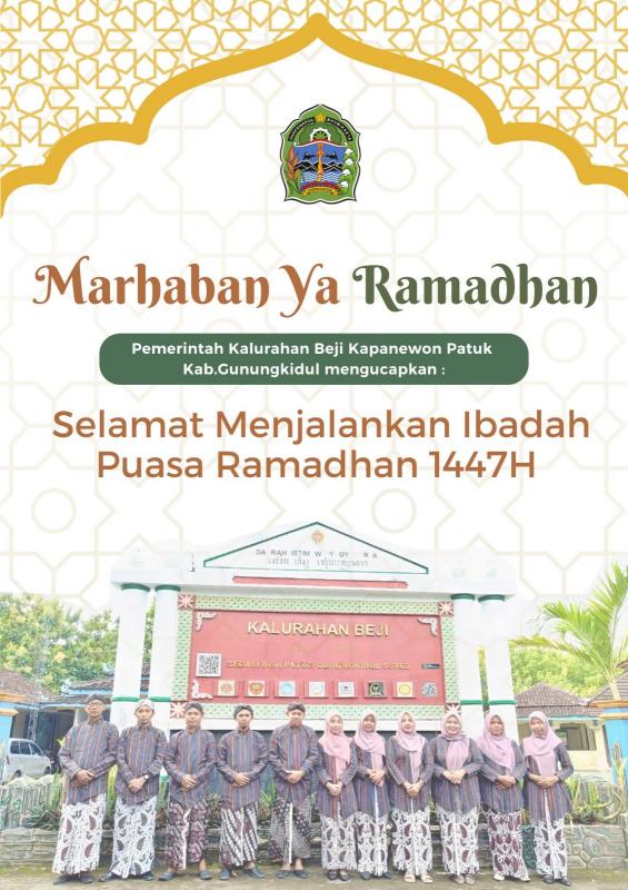 Atas nama Pemerintah Kalurahan Beji, kami mengucapkan selamat menunaikan ibadah puasa, marhaban yaa Ramadhan. Semoga Allah SWT menerima setiap amal ibadah kita dan melimpahkan keberkahan bagi Kalurahan Beji.